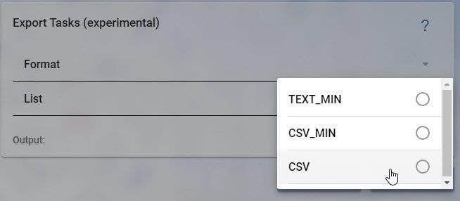CSV Hier werden alle laut aktuellem API verfügbaren Werte verwendet, die Bezeichnungen für die Spalten (auch für das CSV_MIN Format) wurden ebenfalls davon übernommen. https://docs.microsoft.com/en-us/graph/api/todotasklist-post-tasks?view=graph-rest-1.0&tabs=http