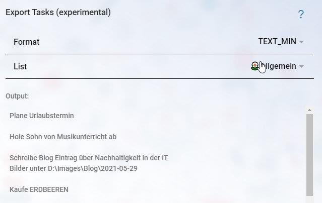 Will man mehr Zusatzinfos speichern (z.B. dueDate), dann weicht man auf das Tabellen Format aus. Am einfachsten versteht man das Format, wenn man zunächst eine Liste exportiert und sich die Daten ansieht. Export wird auch noch weiter unten explizit erklärt. Die Programmierschnittstelle liefert alles im JSON Format und die komplexeren Strukturen lasse ich daher in diesem Format (linkedRessources z.B.), denn die will man im allgemeinen nicht ändern und ich wollte die Tabelle nicht unnötig kompliziert machen.